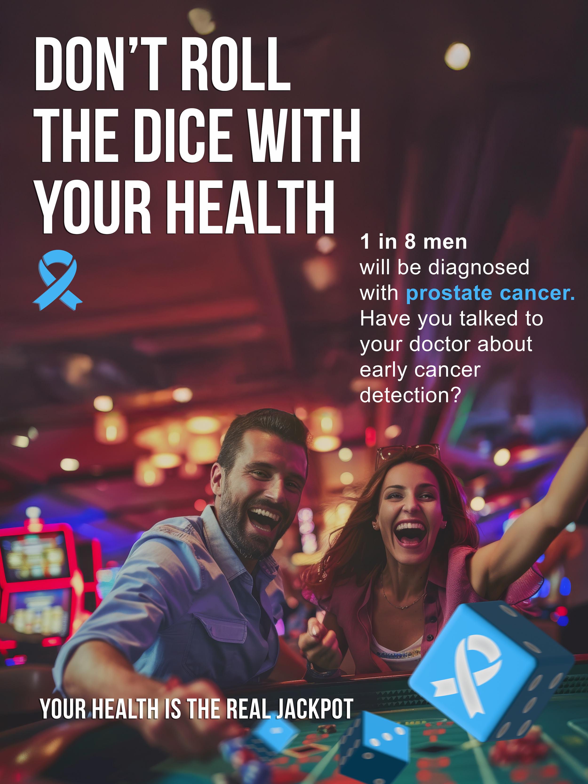 The campaign uses casino and jackpot imagery to reframe health decisions through a risk-and-reward lens, emphasizing that early prostate cancer screening is a simple blood test with potentially life-saving outcomes.