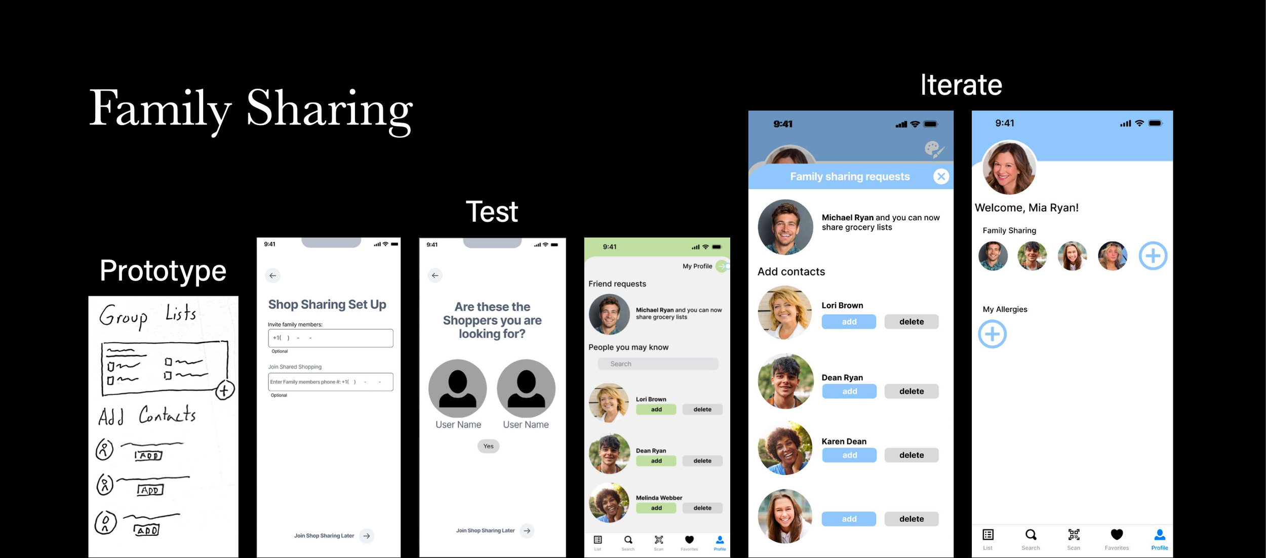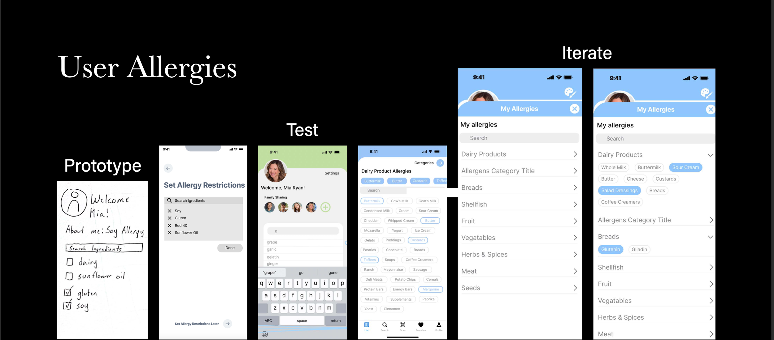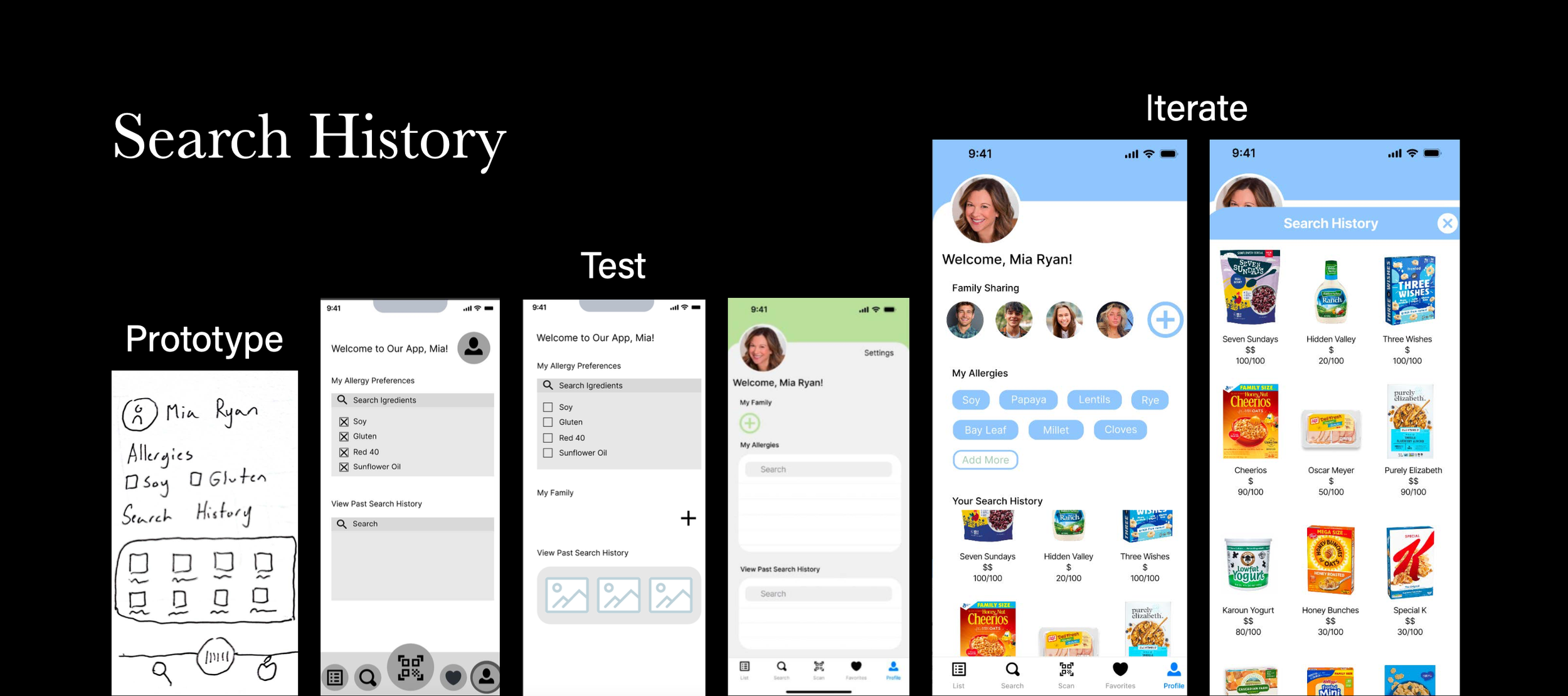 Low-fidelity prototypes were created to explore key features including allergy management, search history, family sharing, and user profile functionality. These screens were iteratively refined through testing and feedback to improve usability, reduce confusion, and better support users with dietary restrictions.