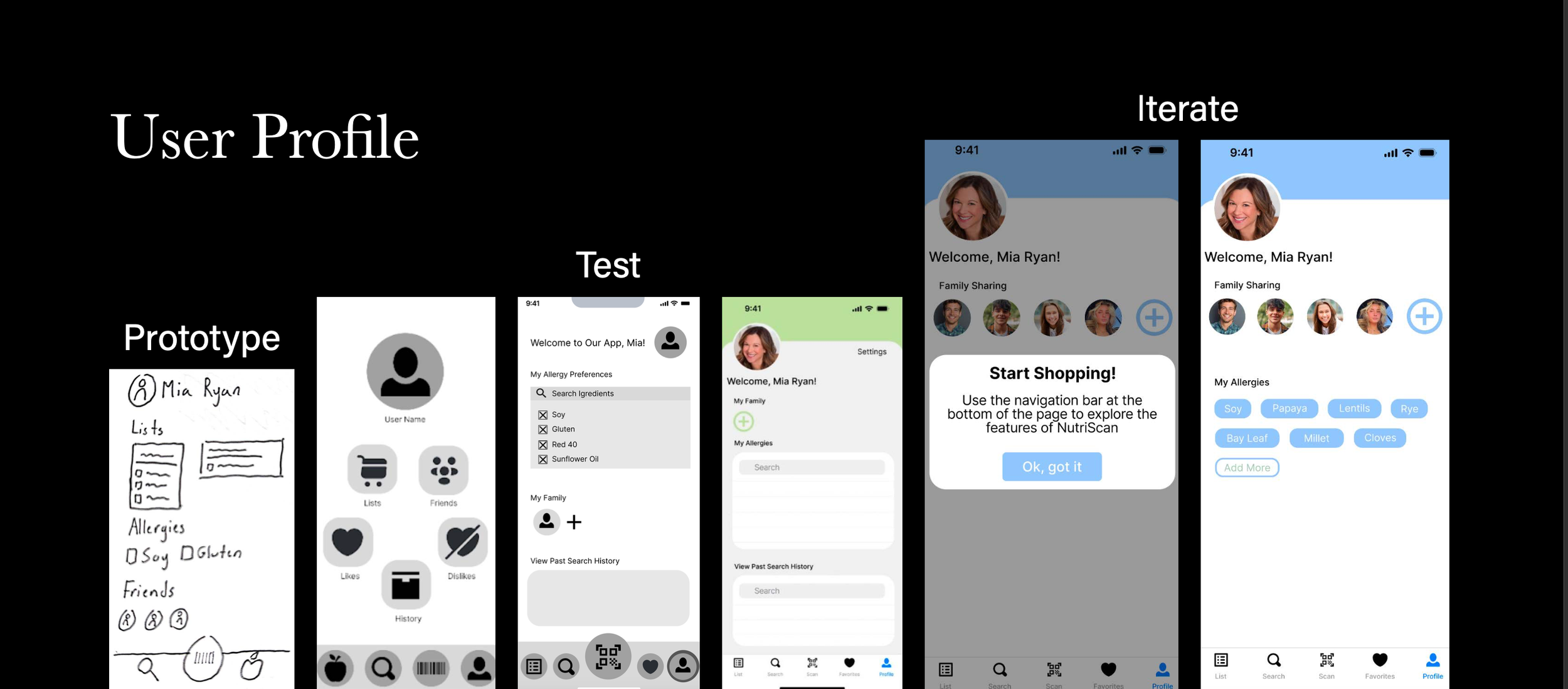 I led the design and refinement of NutriScan’s personalization features, including allergy management, family sharing, user profiles, and search history, creating an experience tailored to each user’s dietary needs.