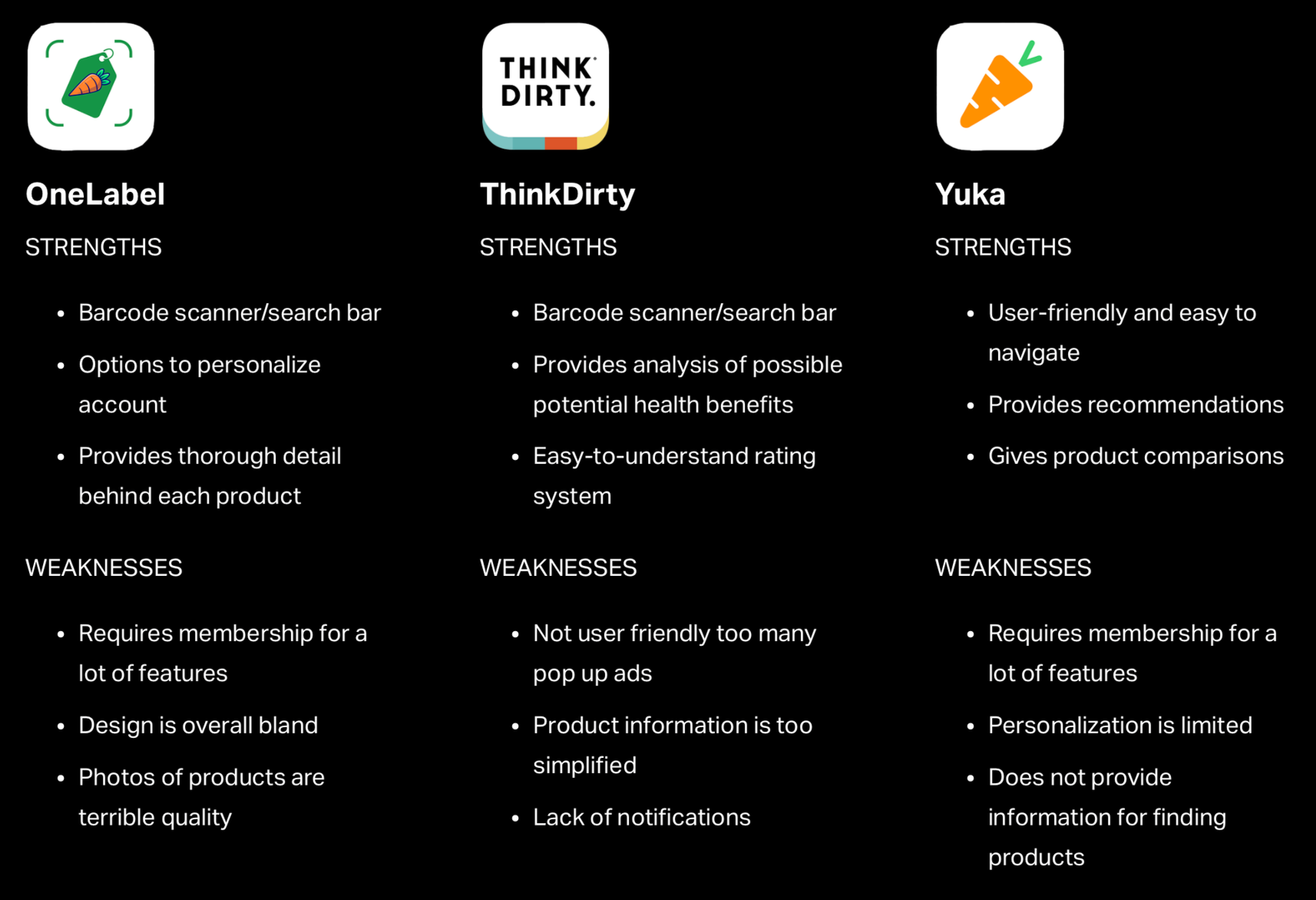 While many competing apps provide nutritional information, they often lack user-friendly explanations and meaningful notification systems that support long-term accountability. By evaluating their strengths and identifying key gaps, this analysis helped define how NutriScan could differentiate itself through clearer insights, simplified guidance, and stronger user support features.
