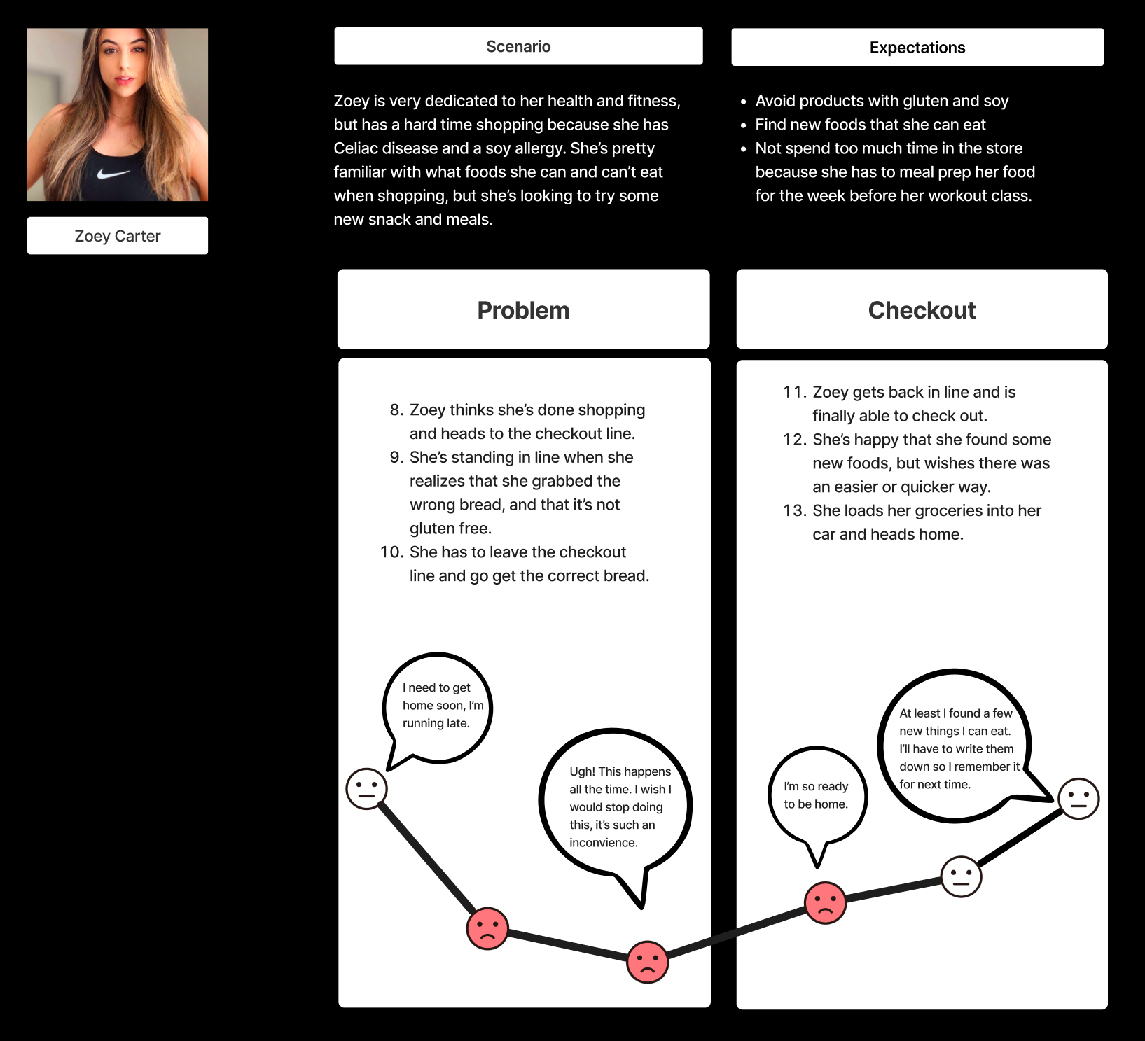 User interviews and journey mapping revealed that grocery shopping can be especially stressful for individuals with dietary restrictions, such as celiac disease. Users expressed frustration with trying to quickly identify safe products, uncertainty around ingredients, and the fear of accidentally selecting the wrong item. Across all journey maps, recurring themes included confusion about what each product contains, stress over whether items meet dietary needs, and concern about forgetting essential items while shopping.