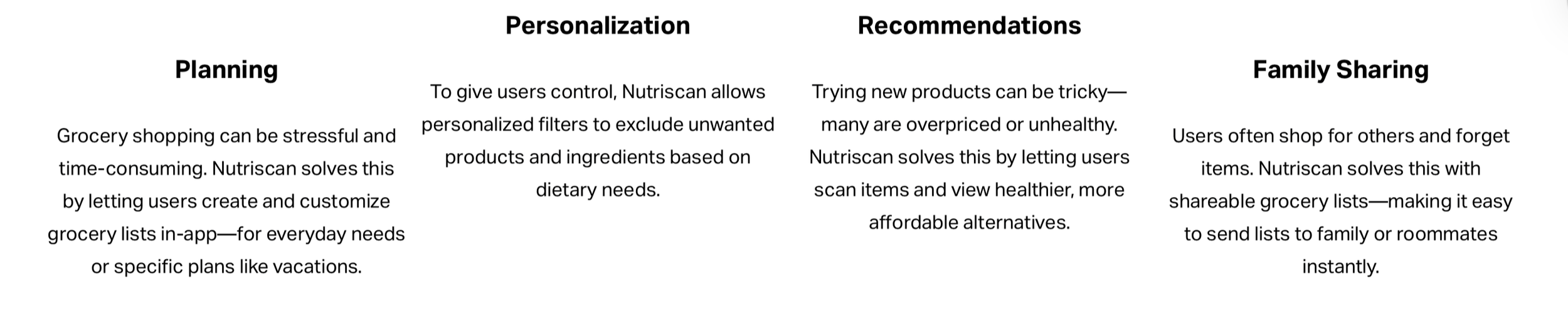 NutriScan is a health-focused grocery app that helps users make informed food decisions through product scanning, personalized dietary filters, and healthier alternatives. The app combines nutrition transparency with smart grocery planning to reduce stress and support healthier choices.